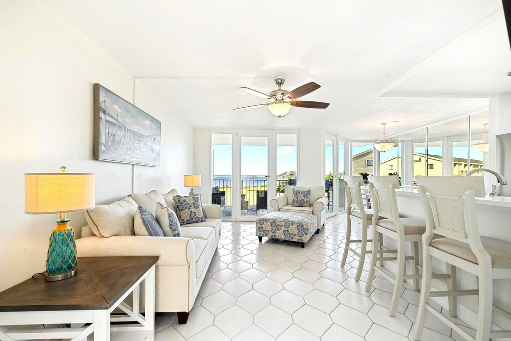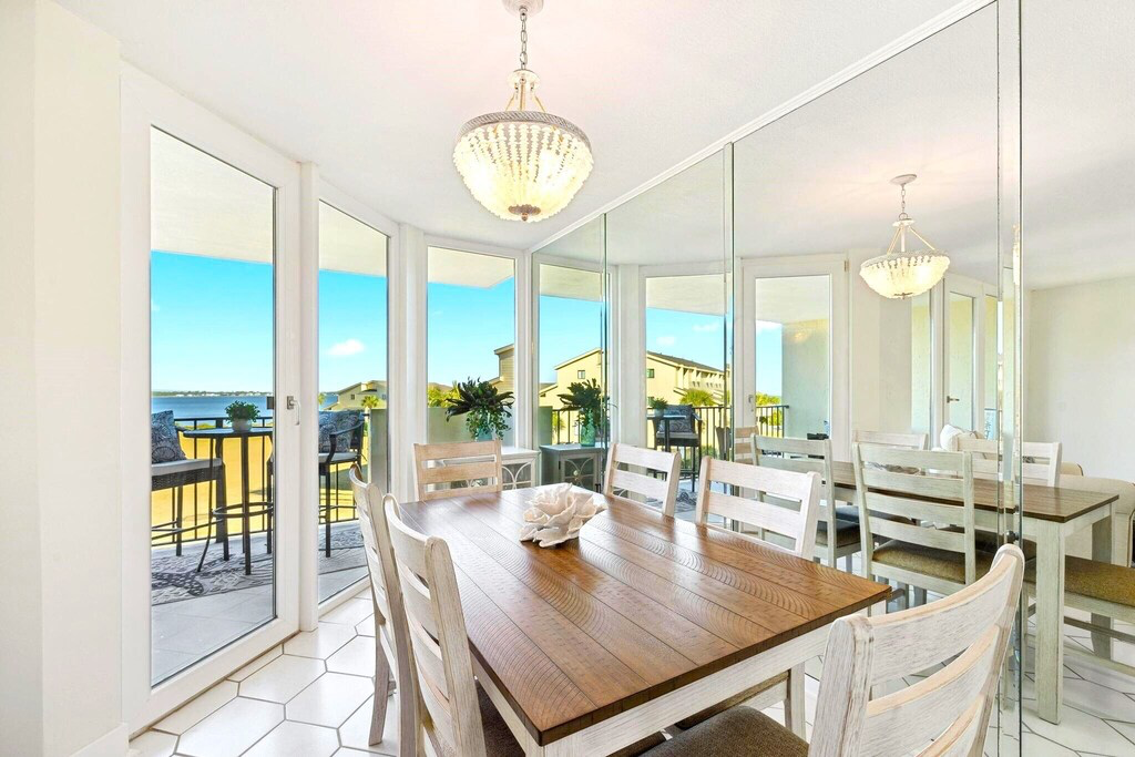 Start your mornings on the spacious covered lanai with coffee in hand, watching dolphins play and pelicans glide by. In the evenings, relax to the glow of Pensacola Sound while enjoying sea breezes—and even live music drifting over from Peg Leg Pete’s right next door 🎶✨